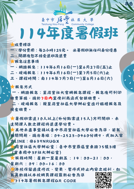 ★臨櫃報名:自114/6/16(一)起,至114/7/5(六)止,請至臺中市后豐社區大學辦公室(豐東國中三樓)報名並繳費。