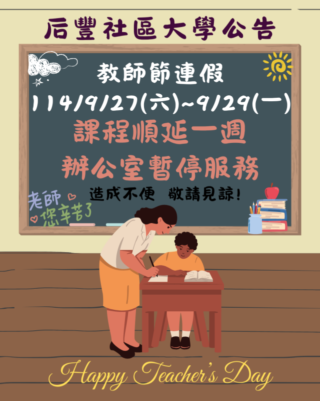 114/9/27(六)~9/29(一)教師節連假 課程順延一週 辦公室暫停服務