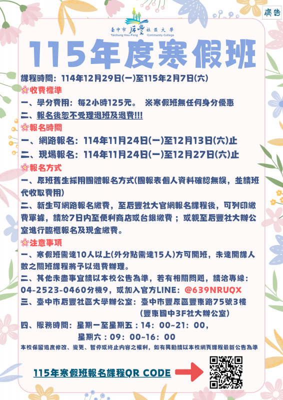 網路報名:自114/11/24(一)起,至114/12/13(六)止,請至臺中市后豐社區大學官方網頁報名,
